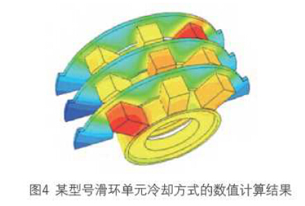 同時,對該型號電滑環(huán)采用數(shù)值計算的方法進行分析,之后可以將計算結(jié)果與測試結(jié)果進行比對,通過這種計算與實驗相結(jié)合的方法來分析其冷卻系統(tǒng)的性能。溫度分布的數(shù)值計算結(jié)果如圖4所示。