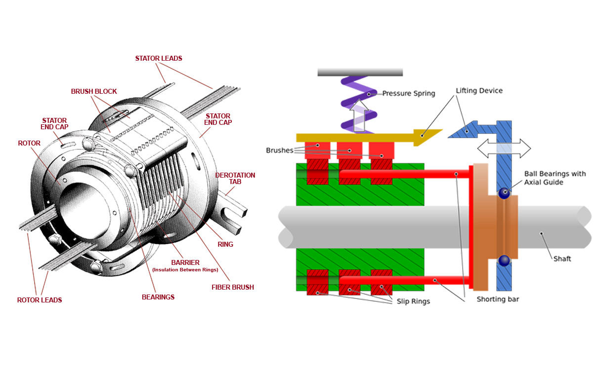 在交流感應(yīng)電動機的一種稱為繞線轉(zhuǎn)子電動機,滑環(huán)不是用于傳輸功率,而是用于將電阻插入轉(zhuǎn)子繞組中。繞線轉(zhuǎn)子電動機使用三個滑環(huán)(通常由銅或銅合金制成)安裝在電動機軸上(但與之絕緣)。由石墨制成的滑環(huán)電刷連接到電阻裝置,例如變阻器。當滑環(huán)與轉(zhuǎn)子一起旋轉(zhuǎn)時,電刷與環(huán)保持恒定接觸并將電阻傳遞到轉(zhuǎn)子繞組。