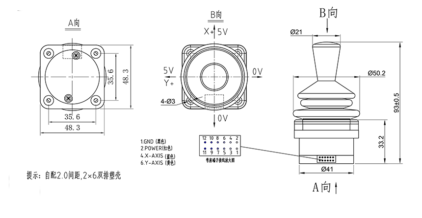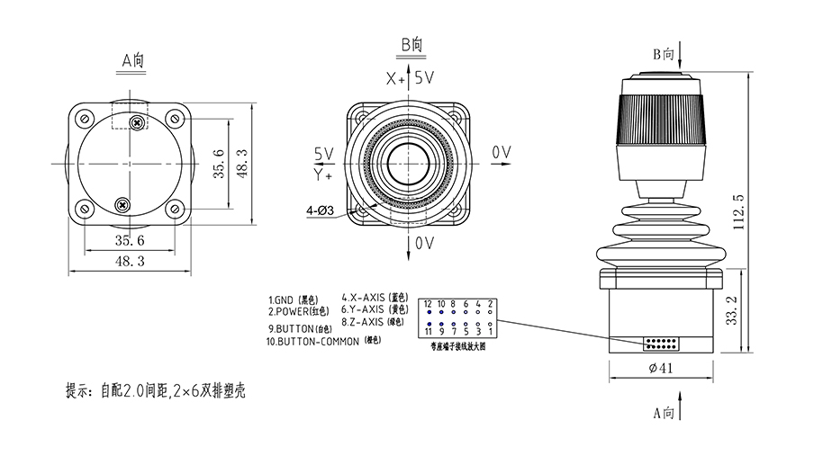導(dǎo)線顏色順序 紅色=5 VDC電源正極 黑色=電源負(fù)極 藍(lán)色=X軸 黃色=Y軸 綠色=Z軸 白色=開(kāi)關(guān) 橙色=開(kāi)關(guān)